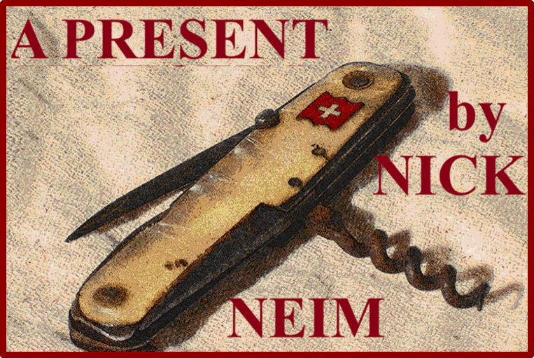 and he handed Boris a brand new shiny steel pocket knife with an emblem – a white cross on a red shield – the trademark of a company of knives for the Swiss National Guard.
